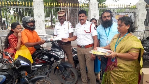 தஞ்சாவூர் பழைய பேருந்து நிலையம் பகுதியில் மாநகர போக்குவரத்து காவல் துறையினர் வாகன சோதனையில் ஈடுபட்டனர், அப்போது அந்த சாலையில் ஹெல்மெட் அணிந்து வந்த இரு சக்கர வாகன ஓட்டிகளை போக்குவரத்து இன்ஸ்பெக்டர் ரவிச்சந்திரன் தலைமையிலான போலீசார் தடுத்து நிறுத்தி அவர்களிடம் சிரித்தபடி கூல்டிரிங்ஸ், ஐஸ்கிரீம், பழம் மற்றும் புதிய வேஷ்டி, சட்டை ஆகியவற்றை வழங்கி நண்பர்கள் தின வாழ்த்துக்களை கூறி அனுப்பி வைத்தனர்.இதனை எதிர்பார்க்காத வாகன ஓட்டிகள் காவல்துறையினருக்கு நன்றி கூறினர்,ஆகஸ்ட் மாதம் முதல் ஞாயிறு அன்று ஒவ்வொரு ஆண்டும் சர்வதேச நண்பர்கள் தினம் கொண்டாடி வரும் நிலையில் காவல்துறையினர் உங்கள் நண்பன் என்ற வகையில் போக்குவரத்து போலீசார் இந்த நூதன ஹெல்மெட் விழிப்புணர்வு பிரச்சாரத்தில் ஜோதி தன்னார்வ தொண்டு நிறுவனத்துடன் இணைந்து ஈடுபட்டனர், இந்நிகழ்ச்சியில் தொண்டு நிறுவன செயலாளர் பிரபுராஜ்குமார், மேலாளர் ஞானசுந்தரி, தன்னார்வலர் ஆர்த்தி உள்ளிட்டோர் கலந்து கொண்டனர்
